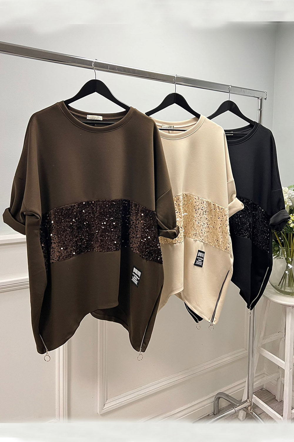 Round Neck , Asymmetric Jumper with Sequined Panel
