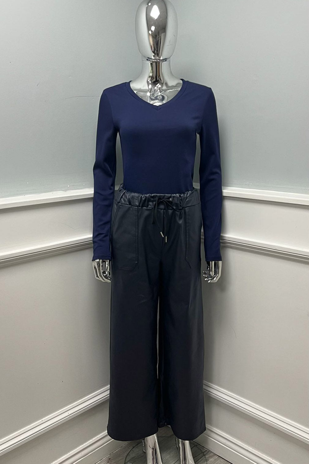 PU leather wide-leg trousers with Elasticated waistband with adjustable drawstring -07513