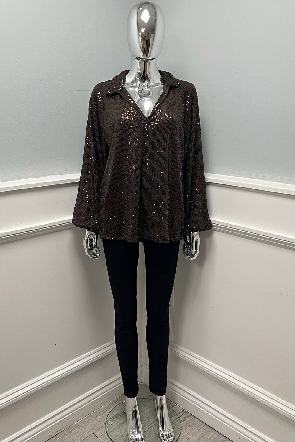 Collared, V-Neck, Elasticated Cuff Sequin Top 1301