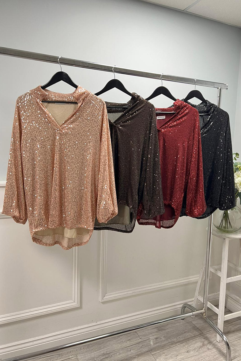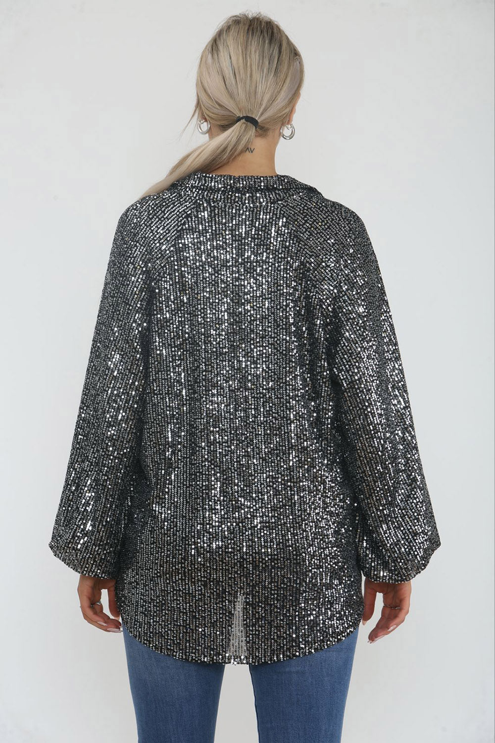 Collared, V-Neck, Elasticated Cuff Sequin Top - 1301