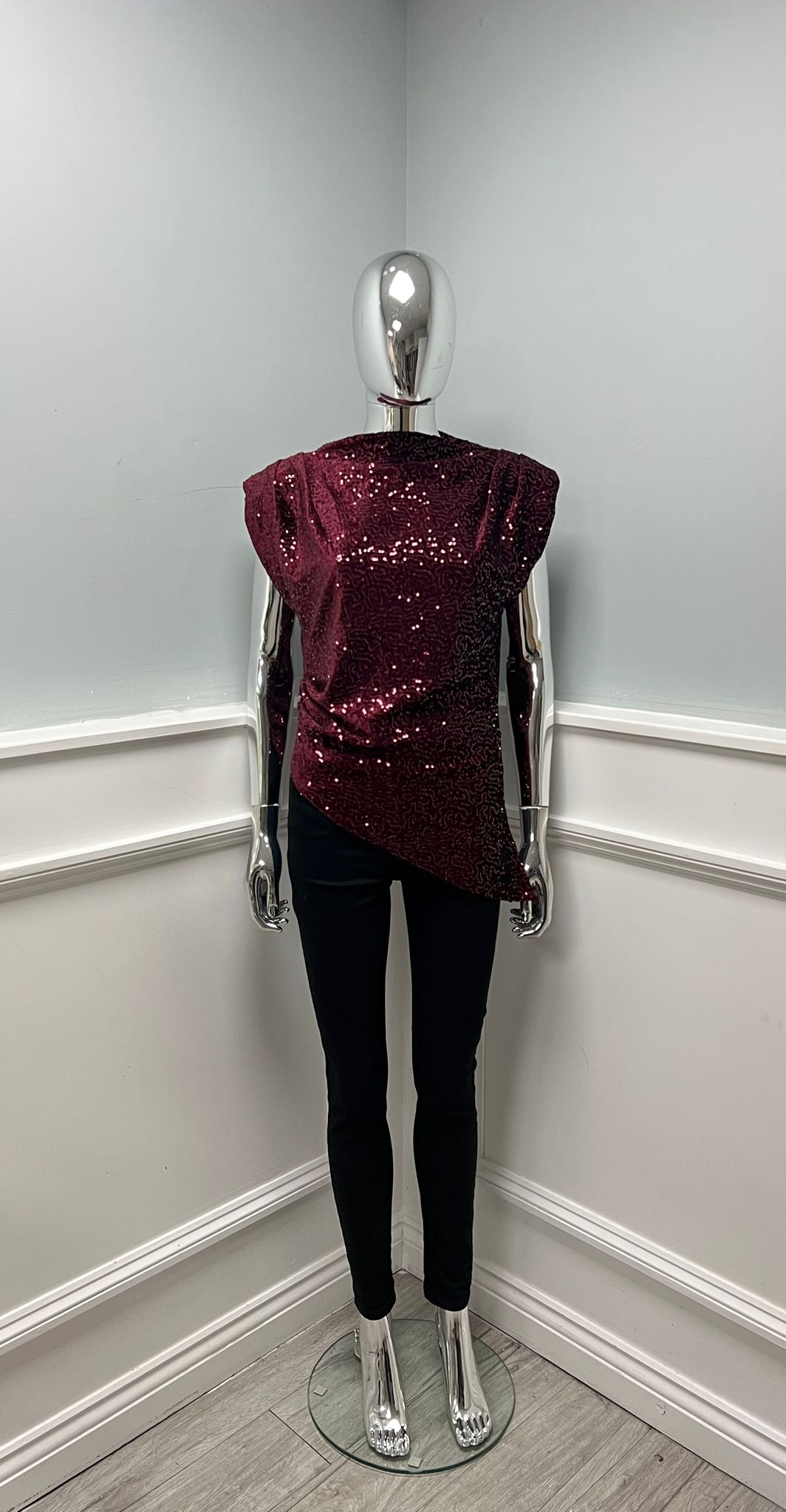 Sleeveless sequin top with padded shoulders and an asymmetric drape hem