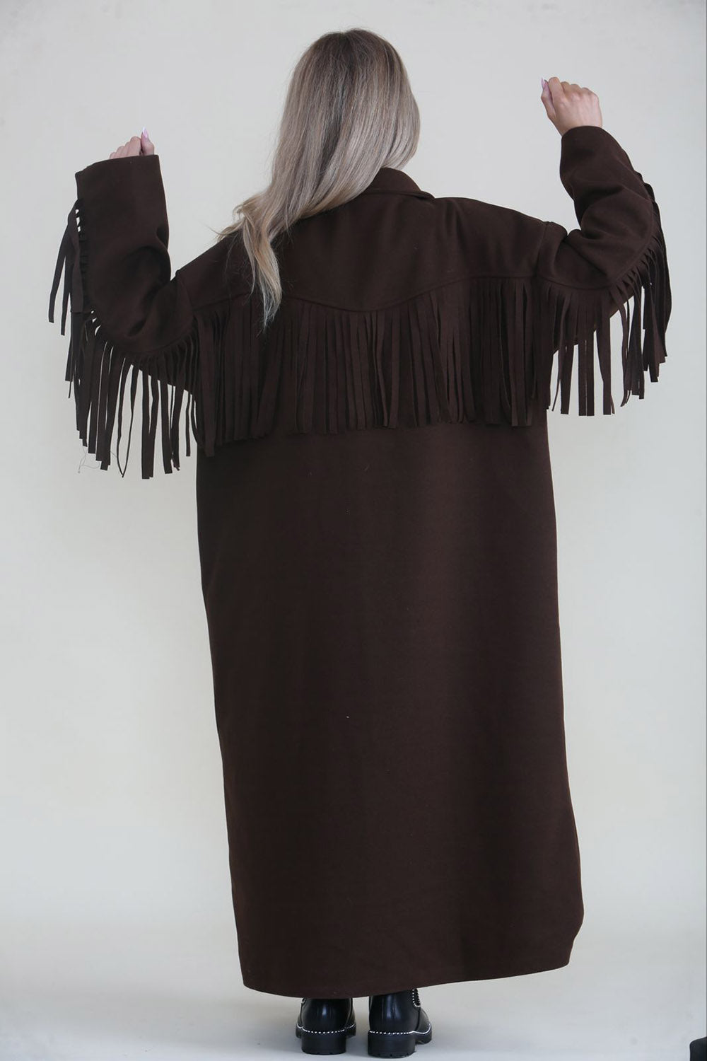 Longline coat with classic notched lapel collar & tiered fringe details at back - 25120