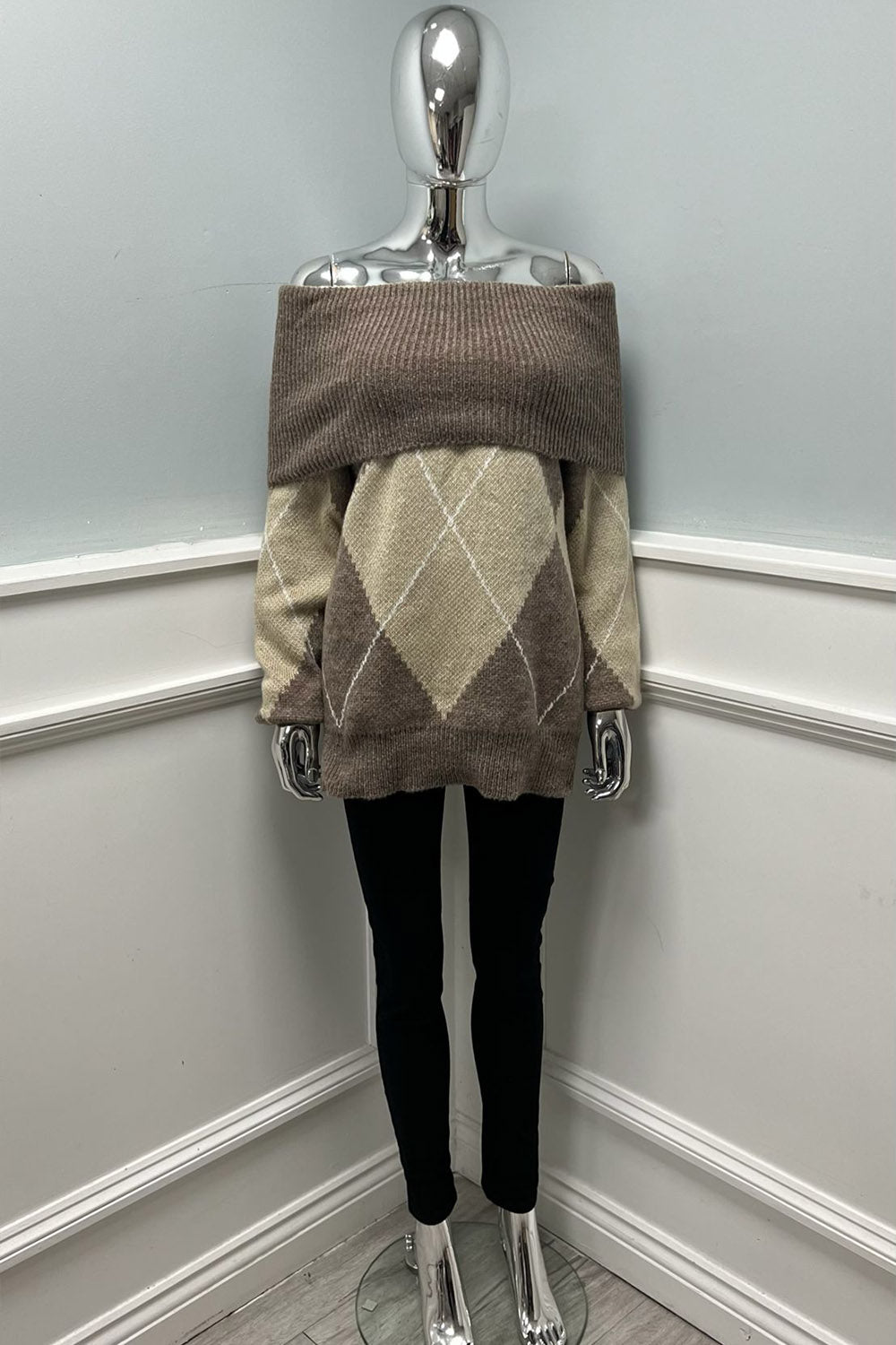 Off-shoulder argyle knit — soft tones, chic neckline 25810
