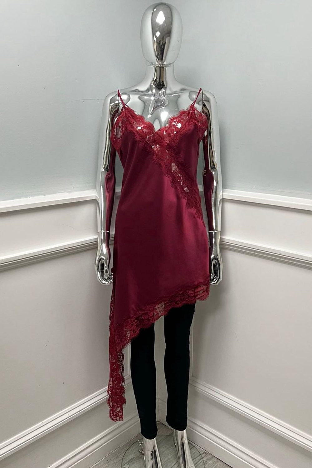 V-neck , asymmetrical, satin camisole with delicate spaghetti straps