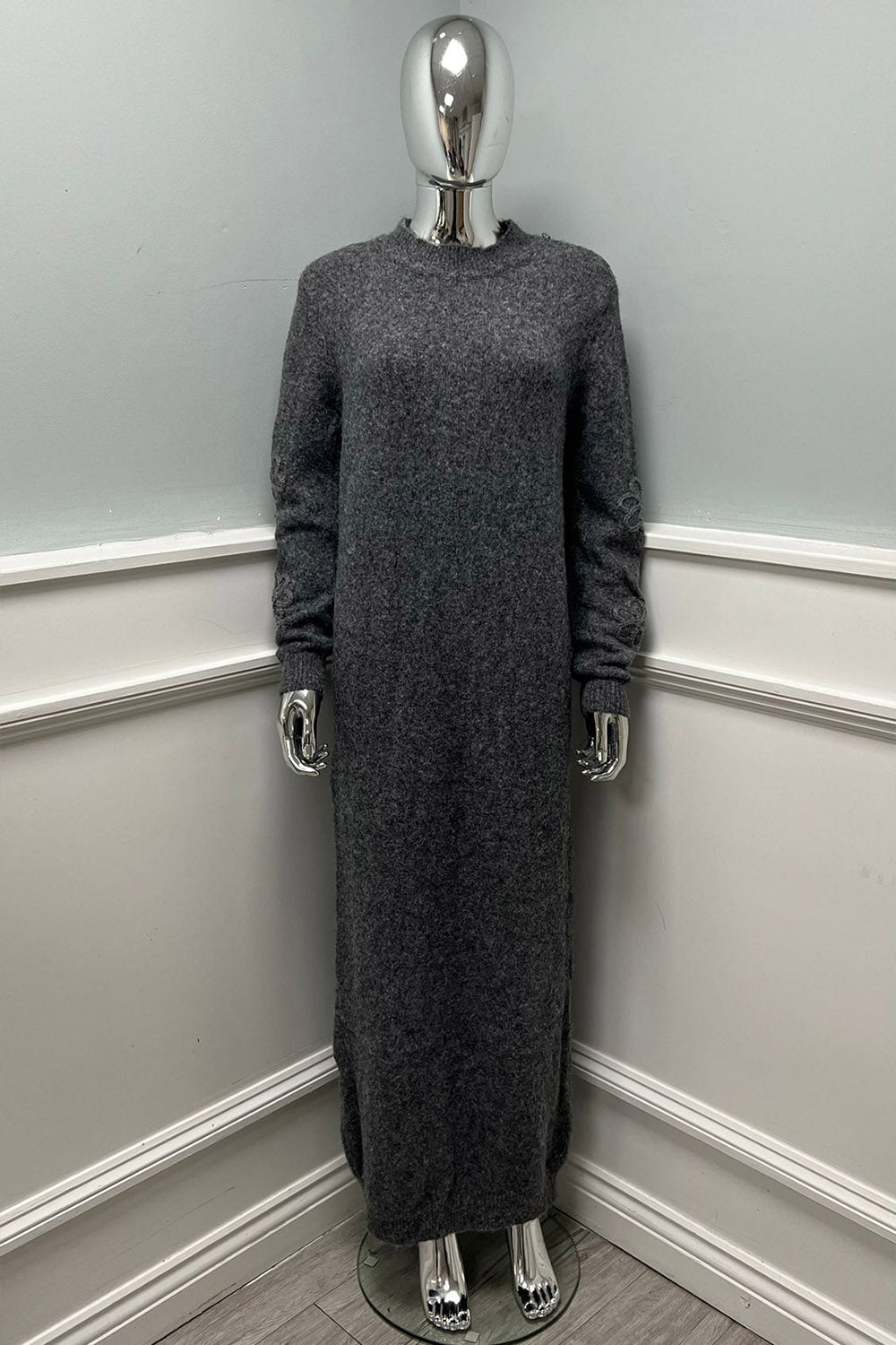 Ribbed Round Neck,Embroidery Flower Sleeve Detailed Knitted Dress - 9195