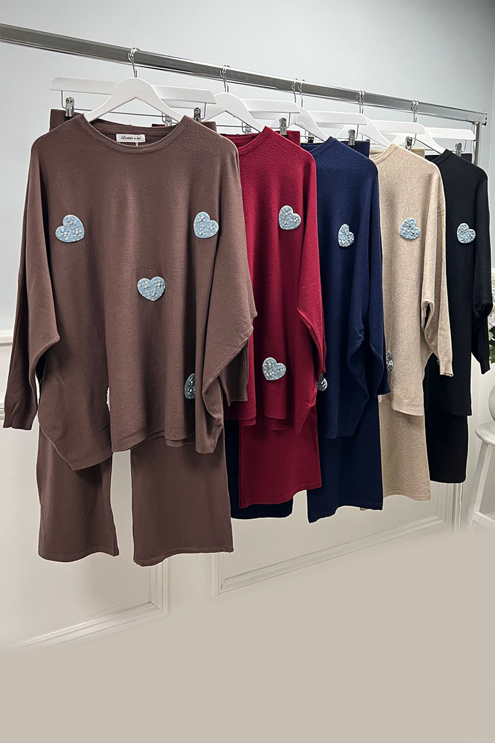 Love Heart Detailed, Diamanté Studded, Elasticated Waist, Wide Leg Two Piece Set HA4261