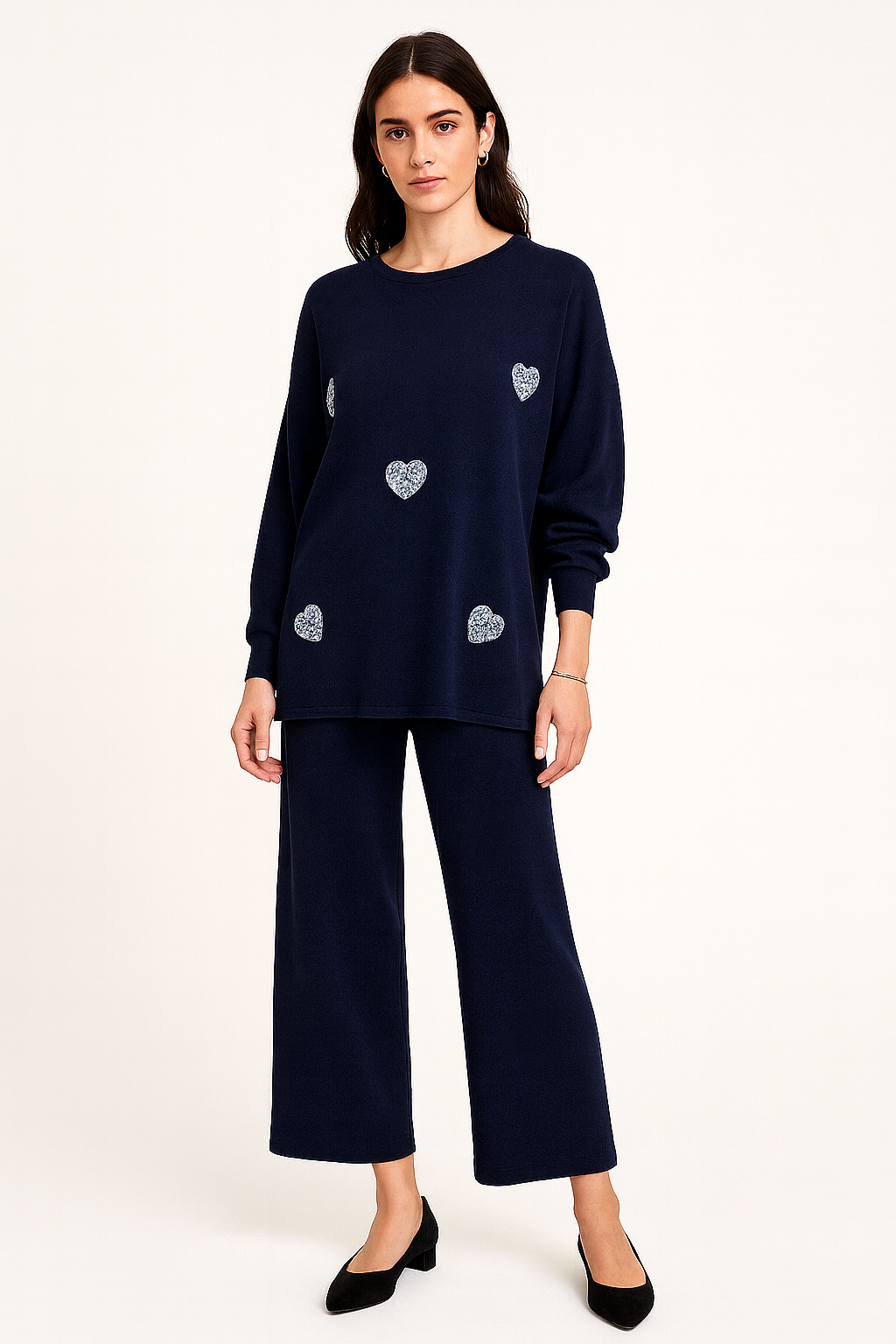 Love Heart Detailed, Diamanté Studded, Elasticated Waist, Wide Leg Two Piece Set