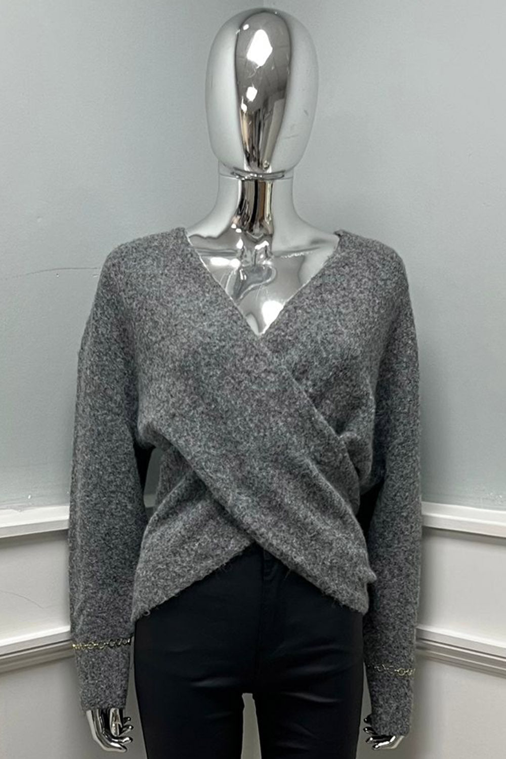 Gold Bracelet Sleeve Detailed, Lana Wool & Viscose Knitted Wrap-over Jumper. - MC4033
