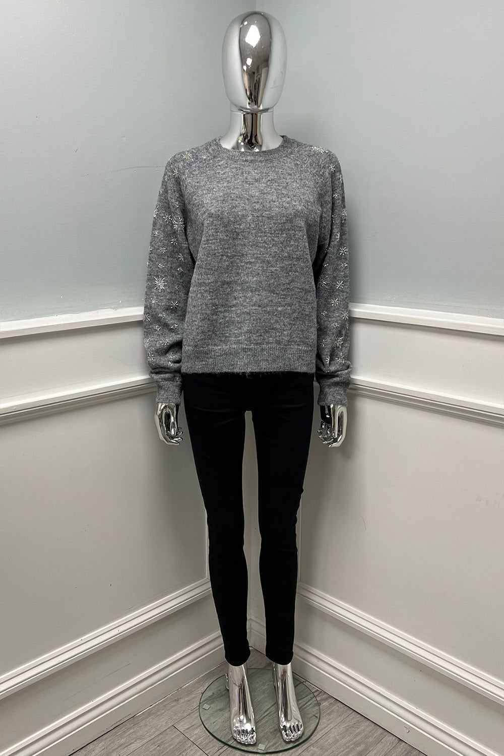 Round Neck, Lana Wool & Polymide Knitted, Embroidered Sleeve Jumper- mc4160