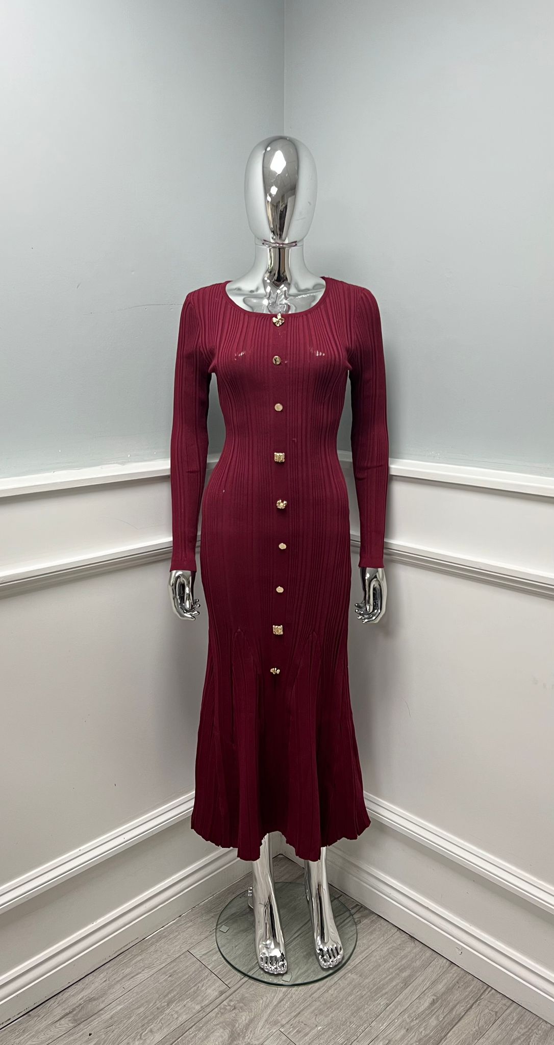 Ribbed knit dress with a sleek button-down front, fitted long sleeves, and a gently flared hem MC4585