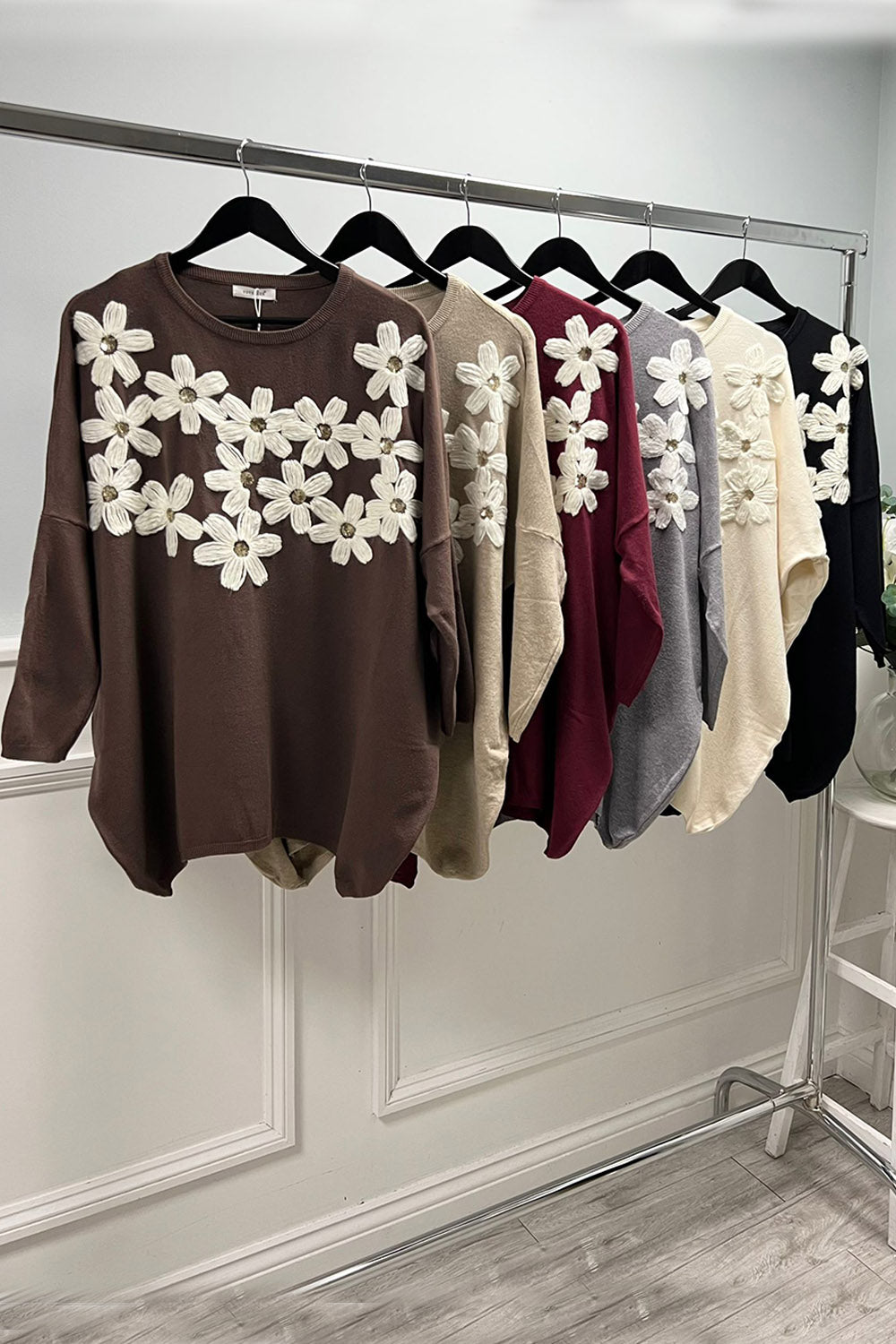 Round neck relaxed fit Long sleeves Jumper with 3D floral appliqués