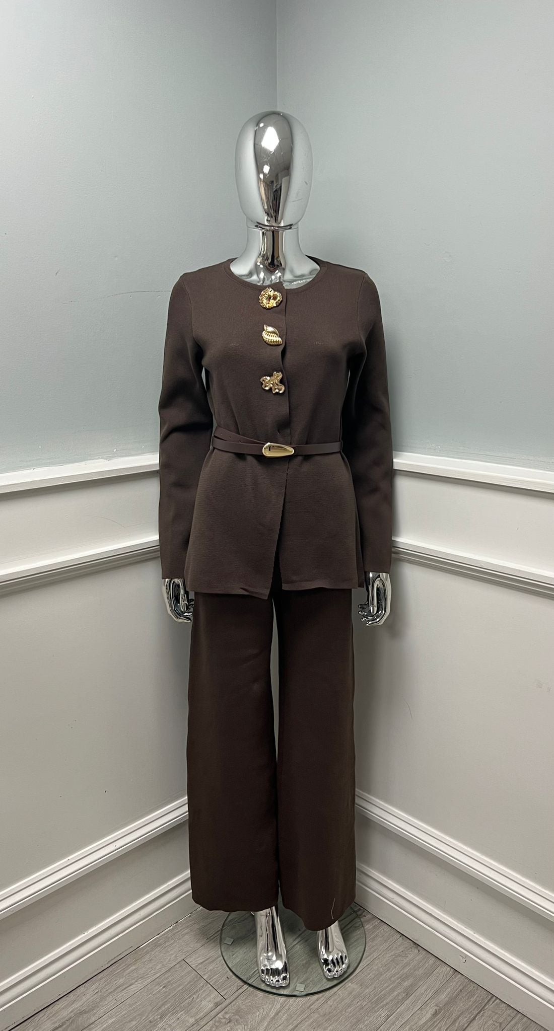 Tailored set with gold buttons, round neck, and a belted waist MO4580