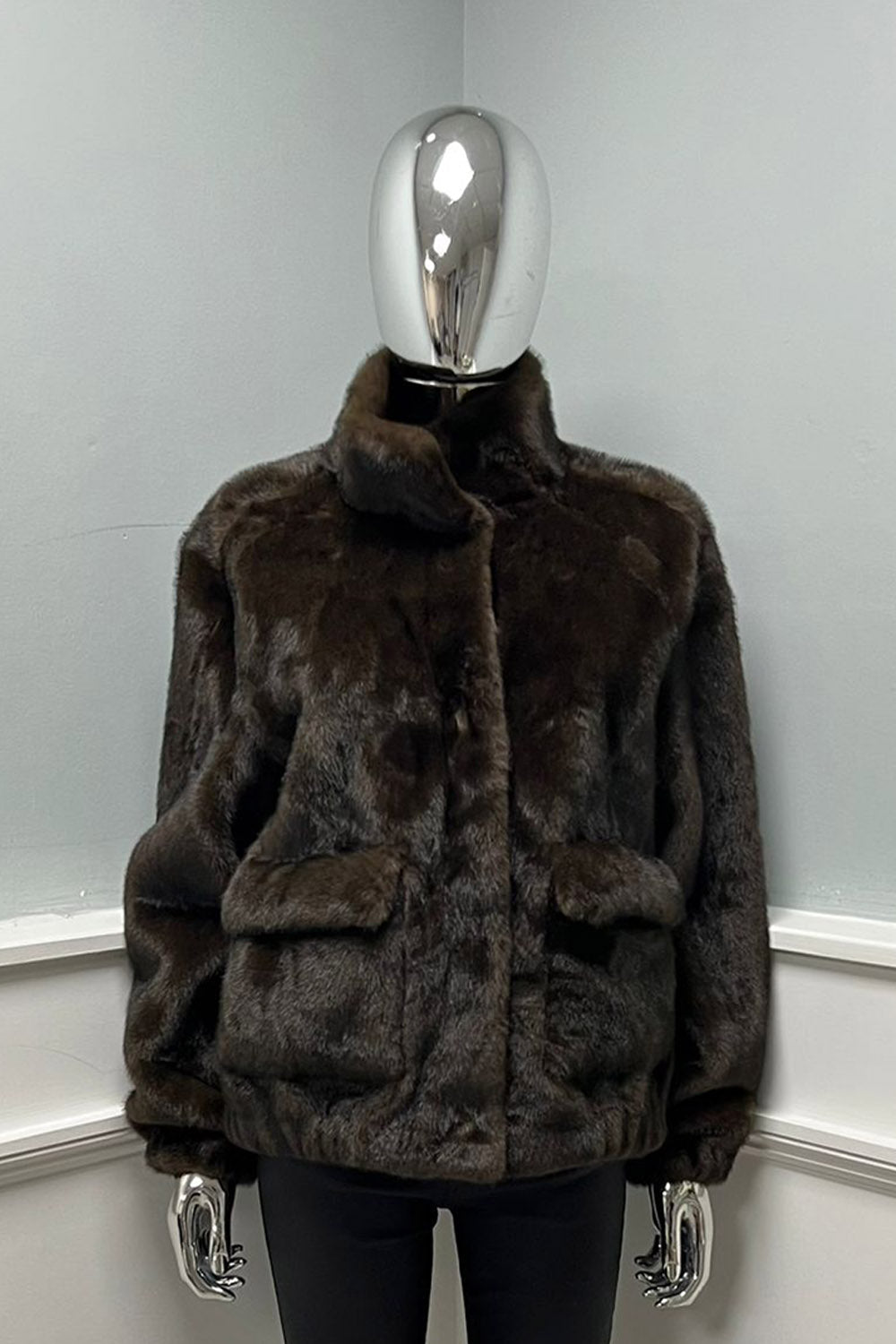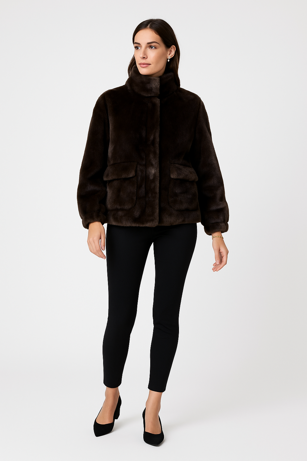 Velvety textured faux fur jacket with high stand collar & large, flap-style front pockets